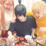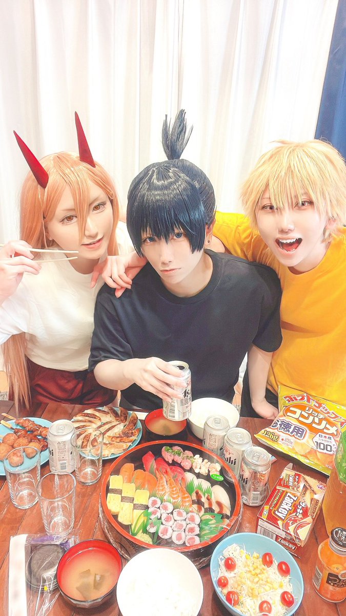 8 35 [コスプレ/cosplay] チェンソーマン 早川家❤️💙🧡 アニメ12話ED お寿司餃子パーティーしてきました 🍣🥟🥗🍺🧃🥤 23/03/16 20:34