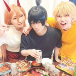 [コスプレ/cosplay] チェンソーマン 早川家❤️💙🧡 アニメ12話ED お寿司餃子パーティーしてきました 🍣🥟🥗🍺🧃🥤