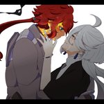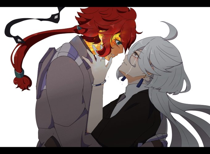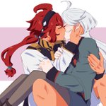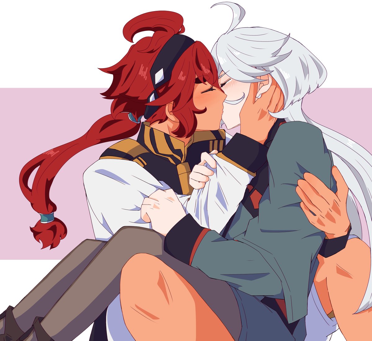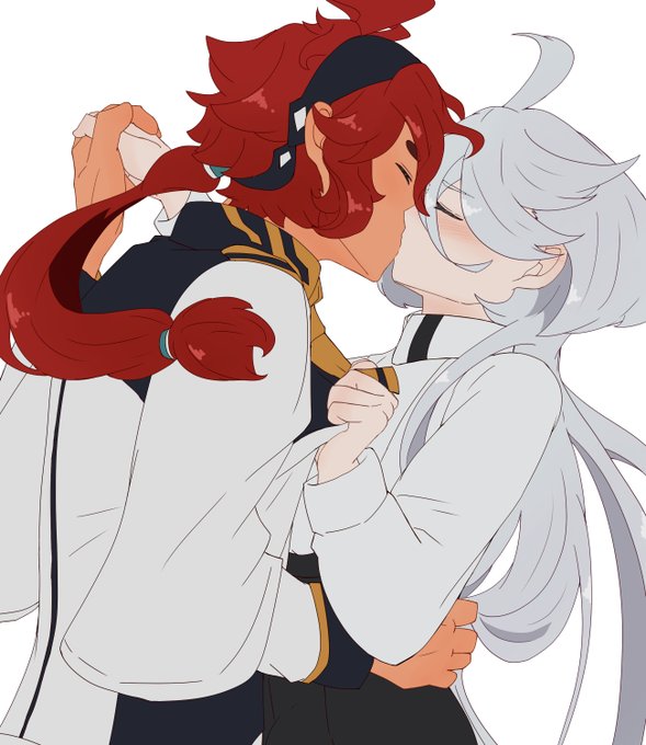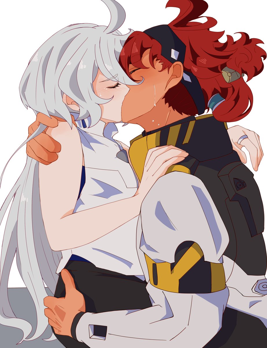 決闘後、昂ぶりを抑えきれず嫁にぶつけるスレッタはいると思うし、キッスに応えることにいっぱいいっぱいで束ねた髪を解かれたりジャケット脱がされたりとびくともしない婿にされるがままのミオリネさんもいると思う、な妄想。 (ミオリネさんがスーツ姿なのは出張帰りだから) #水星の魔女 #スレミオ