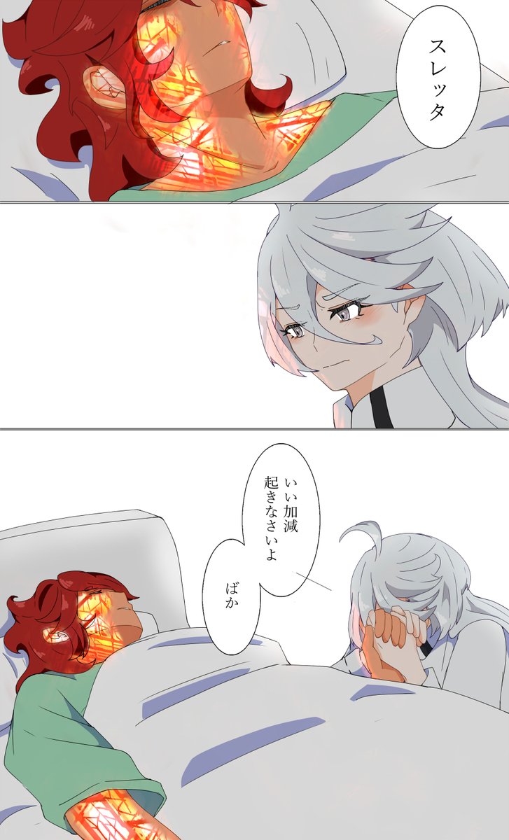 (独りに、しないで――) 決戦後からしばらく目覚めなかったスレッタはきっといると思うし不安で仕方ないミオリネさんもいると思う、な妄想。 3年後にようやく身体が動くようになってきたということは、当初はきっと指先ひとつ、瞼さえ動かせなかったのかも。 #水星の魔女 #スレミオ
