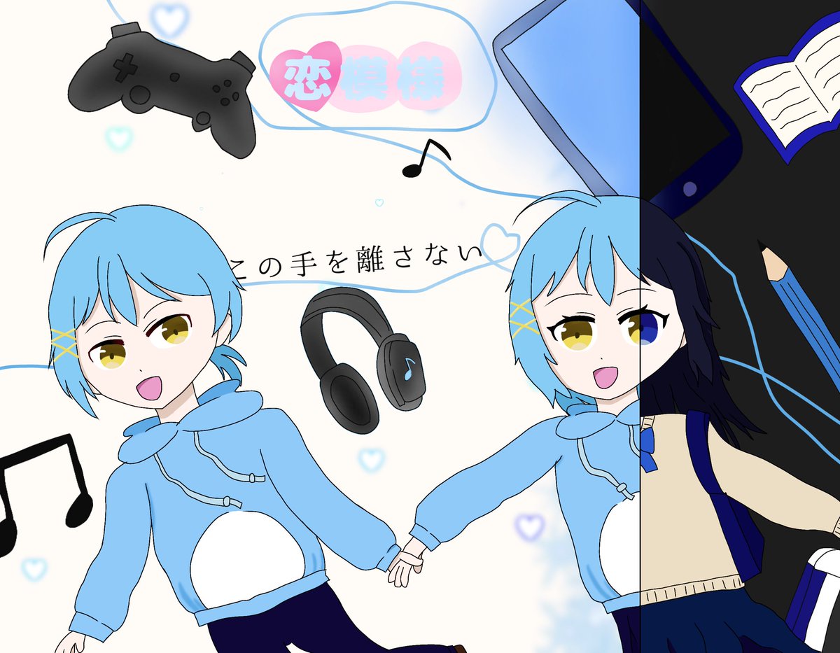 2 10 #ぷりだぁと #そあらーと 恋模様! 白い方がネットの世界、黒い方が現実みたいな感じです(語彙力皆無)ネットではイラストなどで変えれるので女の子のネットのところだけ水色の髪にしてみたり黄色の目にしてみたりした! 21/12/07 01:00