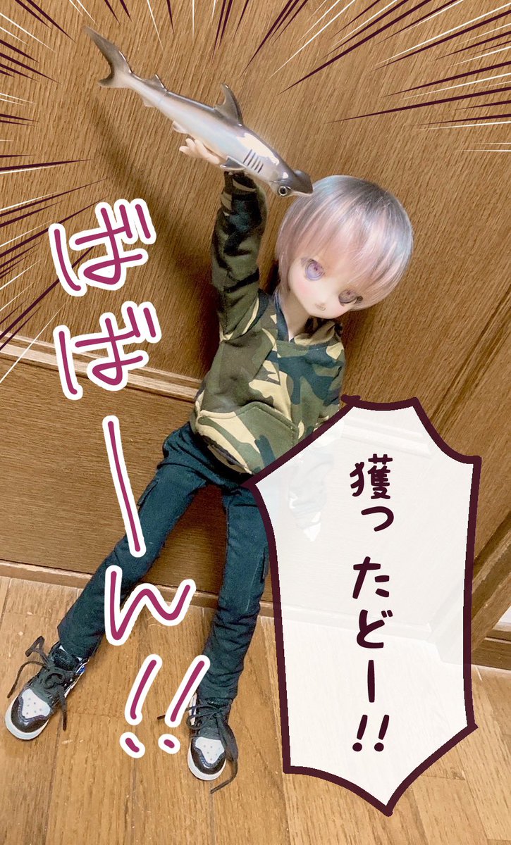 リゲル「みんな!見てくれ!サメだぜ、かっこいいだろ~!!」 サメではしゃぐリゲル君☺️ あんこさんにセリフとか加工してもらったw #MDDはいいぞ #ねるっ子 #うちの子かわいい #ドールオーナーさんと繋がりたい