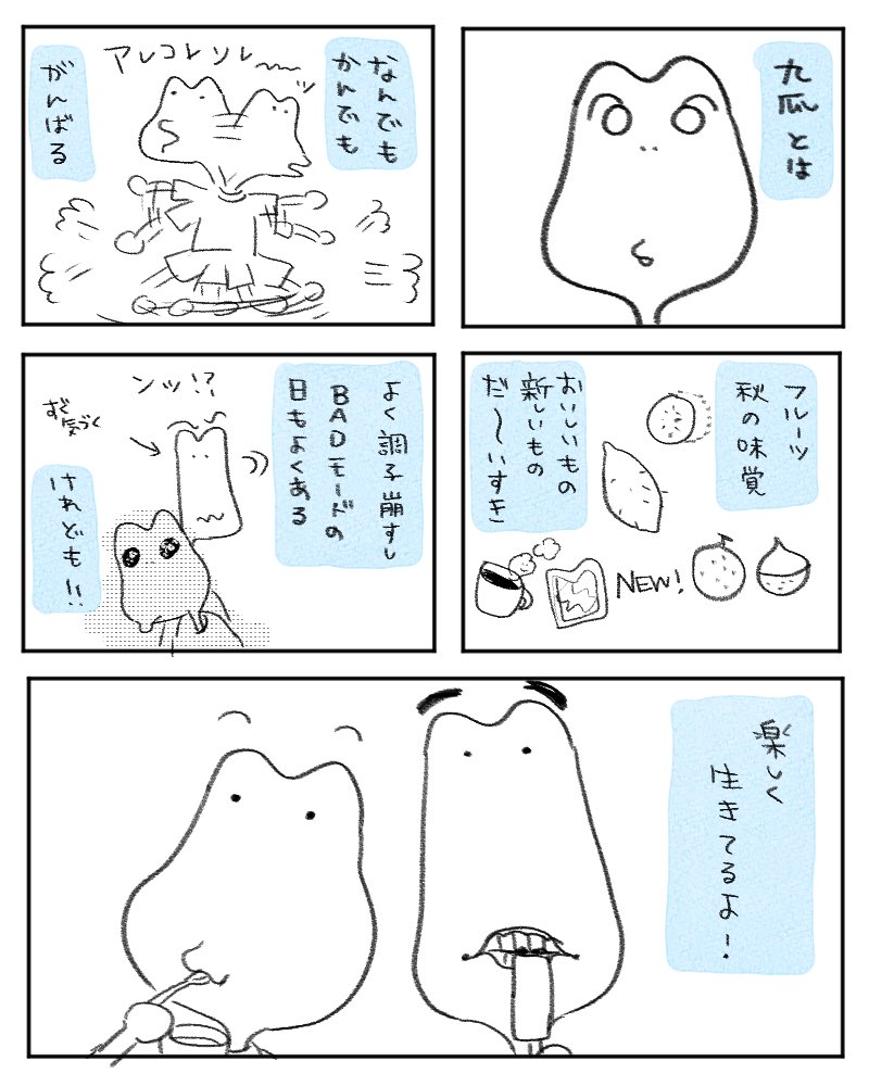 オットとは、九瓜とは。 秋の味覚、美味しいね🍁 (1枚目はオットが描いたよ☺︎✍️) #コミックエッセイ #エッセイ漫画 #漫画が読めるハッシュタグ #創作漫画 #絵日記 #エッセイ
