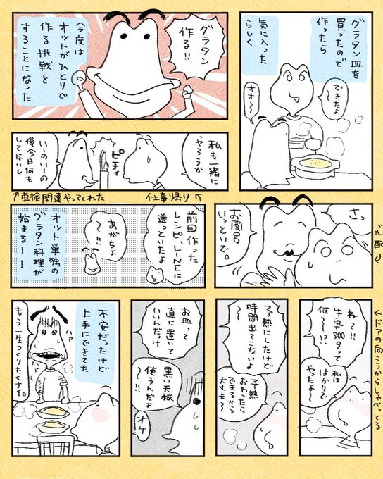 1 4 オットVSグラタンレシピ 普段オットの料理は炒める・焼く、味噌汁のシンプルスタイルなので、工程の多いグラタンは大変だったと思います🍳 #コミックエッセイ #エッセイ漫画 #漫画が読めるハッシュタグ #創作漫画 #絵日記 #エッセイ 23/02/19 16:55