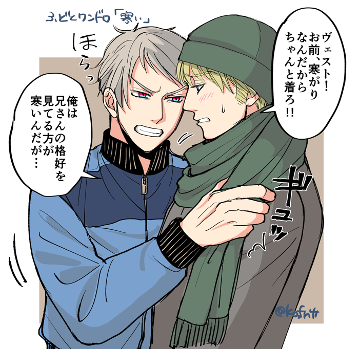 お題:「寒い」 +5min. #普独版ワンドロ @hudoku_1 兄さんは寒さに強いけど手足が冷たくて、弟さんはmkmkあったかいけど寒がりのイメージ