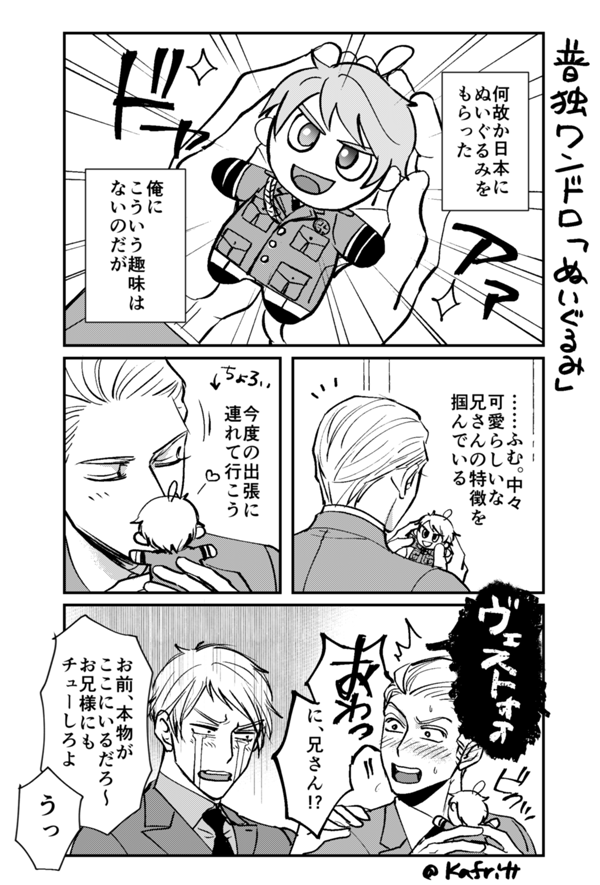 【遅刻】お題:「ぬいぐるみ」 +1h #普独版ワンドロ @hudoku_1 出張にも持って行ったし、後に執務室に置かれて職員たちの噂になる