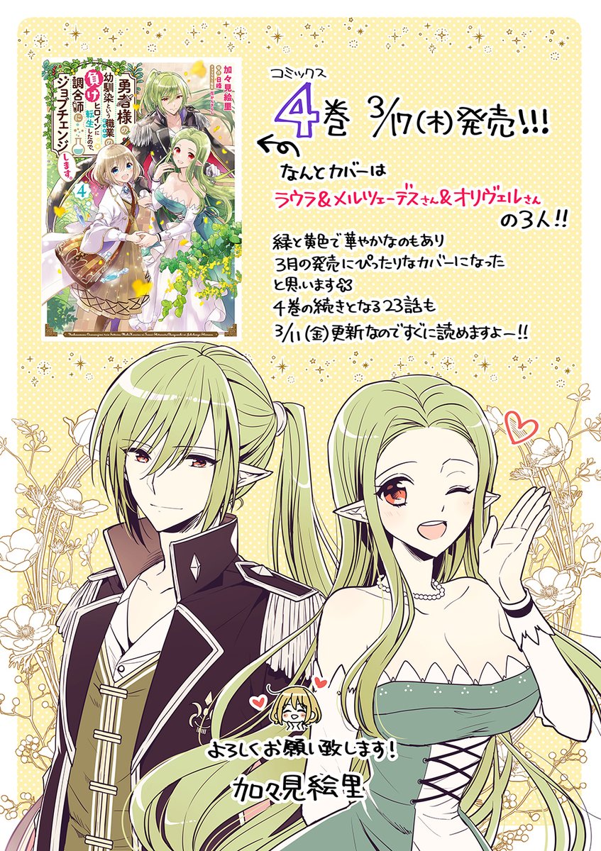 「勇者様の幼馴染~」コミックス4巻が3/17(木)に発売される事になりました~!🎉🎉表紙はメルツェーデスさんとオリヴェルさんです🌸 ご予約頂けると嬉しいです☺️各特典については後日紹介します! amazon.co.jp/dp/4046812613/ ◆4巻告知とルカーシュの番外編漫画も公開中✨ comic-walker.com/contents/detai…