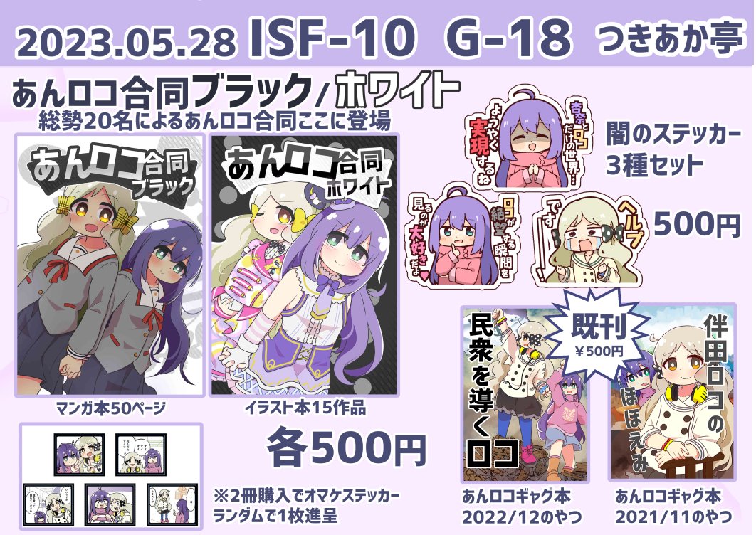 83 124 ISF10でのお品書き 新刊 あんロコ合同各500円 (2冊同時購入でおまけステッカー) 闇のステッカー500円 めいむくん(@meimu_MMY) がかわいいステッカーをつくってくれました! 既刊もありますのでよければ! #ISF10 #あんロコ合同BW 23/05/20 12:05