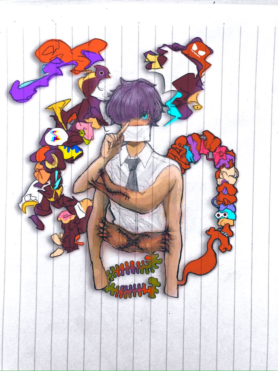 落書きで描いてたんだけど人だけだと足りない気がして、ぐちゃぐちゃな線を描いてなぞったらいい感じになったからオヌヌメ 塗り忘れモンスターボール😭 #絵かきさんと繋がりたい #落書き #デジタルイラスト