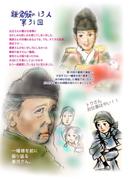 10 47 明日は #鎌倉殿の13人 第16回の放送ですね。 前回の感想絵。 正座して身を乗り出して観てしまいました。 壮絶な足固め。 残念過ぎる別れもありました。 これからもたくさんあるのだと思います。 #梶原景時 さんすてきです。 描ききれないほどです。 #鎌倉絵 #殿絵 22/04/23 17:40
