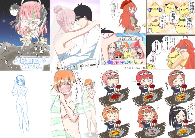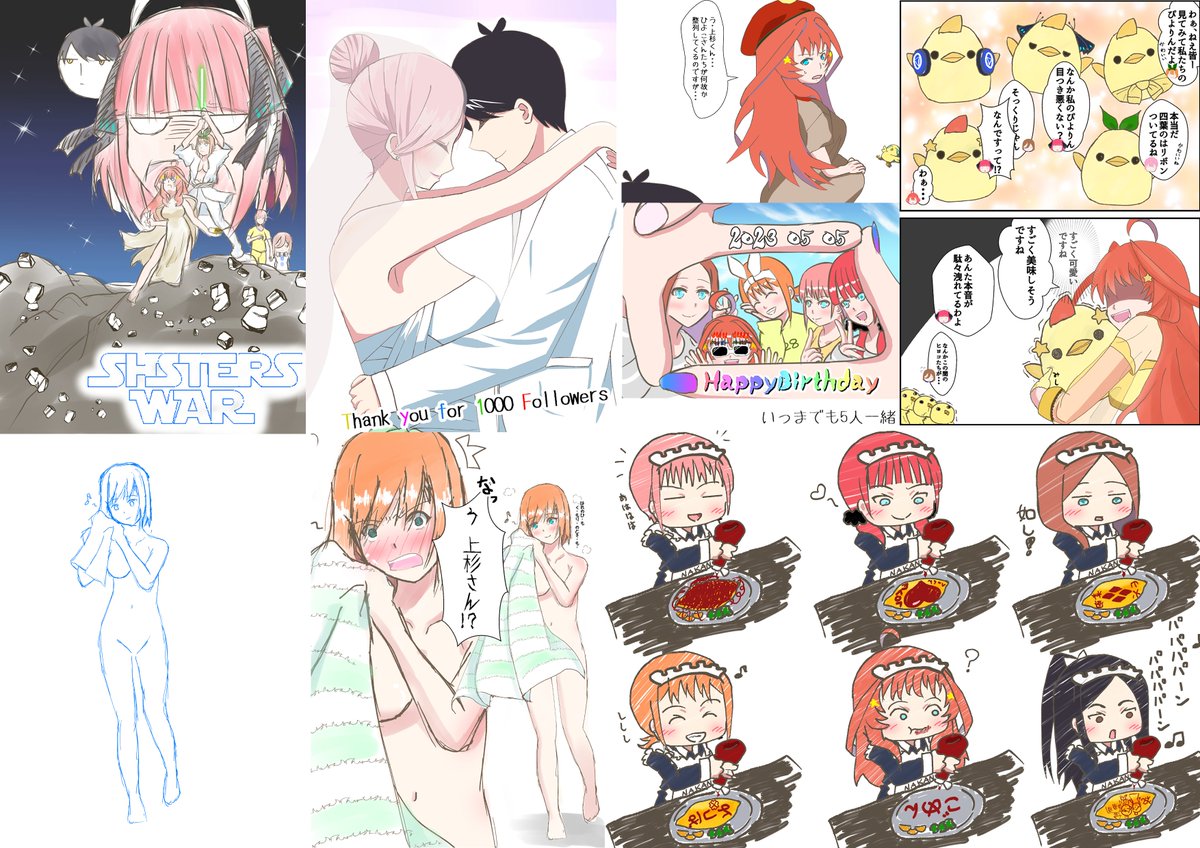 #今月描いた絵を晒そう 1コマを1枚と換算したら結構な枚数描いていることにはなるが← 多分過去最多で五つ子ちゃん描いてるんじゃないかなぁ? 今月は風太郎も描いたし、某弟も描いたし 五つ子ちゃんだけじゃない1ヵ月でした! 観てくれた全ての方に感謝! 来月もよろしくです #五等分の花嫁