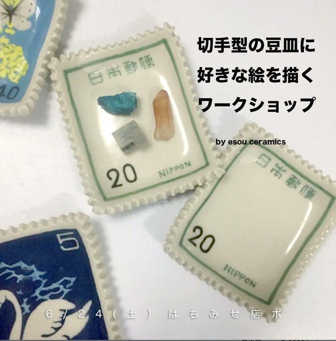 🗓𝗪𝗘𝗕 𝗖𝗢𝗠𝗜𝗡𝗚 𝗦𝗢𝗢𝗡! 𝟬𝟲∕𝟭𝟰(水) 𝟮𝟬:𝟬𝟬 - WS予約 esou ceramics / 切手型の豆皿にお好きな絵を描くワークショップ 6/24 切手型の豆皿に、好きな絵を描いて自分だけのスペシャルな一点ものに仕上げるワークショップです。 83s.shop/items/6481a714…