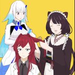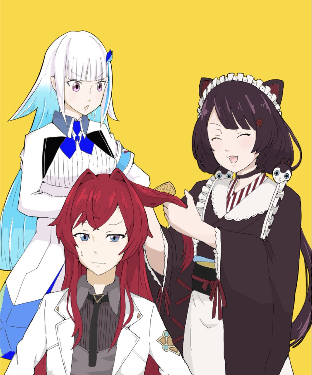 リ「あれ、三つ編みってこんな感じだっけ?こうだっけ?」 と「アハァー↑」 ア「…私の髪で遊んでる?」 #絵ンジュ #ヘル絵スタ #いぬいらすと