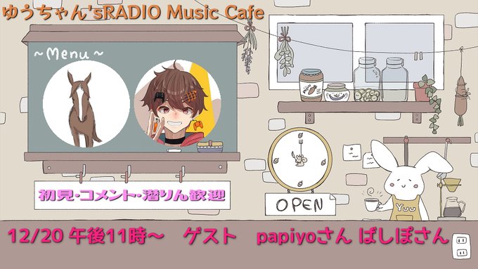 12月20日 午後11時~ ゆうちゃん's RADIO Music Cafe ゲスト: papiyoさん @papi_yoro ばしぽさん @basipo84 #歌い手さんMIX師さん絵師さん動画師さんPさんと繋がりたい #歌い手さん好きと繋がりたい 配信場所⇩ twitcasting.tv/kaigiyuu