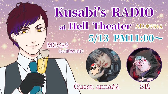 Kusabi's RADIO at Hell Theater 5月13日 午後11時~ MC:くさび(CV:荊棘つばき) Guest:annaさん S氏 @IbaraTsubaki @utaimasu_anna @BFC_O 地獄のショー劇場にようこそ🥀🎭 配信場所⇩ twitcasting.tv/kaigiyuu #歌い手さんMIX師さん絵師さん動画師さんPさんと繋がりたい