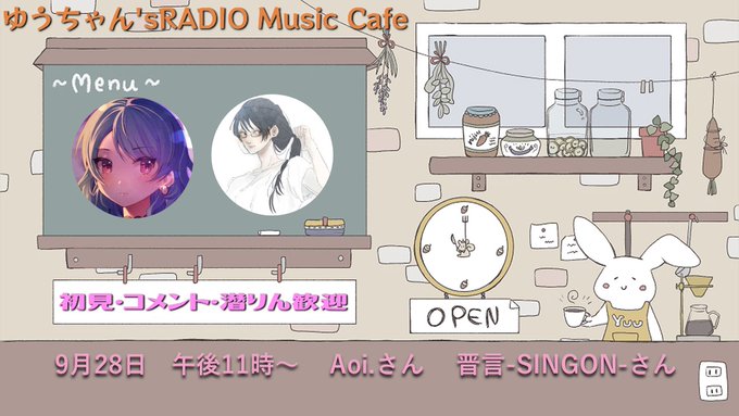 9月28日 午後11時~ ゆうちゃん's RADIO Music Cafe ゲスト:Aoi.さん 晋言-SINGON-さん @Aoi_sg0707 @singon_1228 #歌い手さんMIX師さん絵師さん動画師さんとPさん繋がりたい 素敵な時間になるに違いない! 配信場所⇩ twitcasting.tv/kaigiyuu