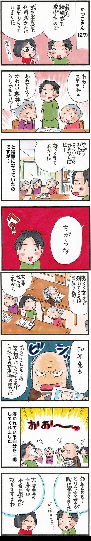 おはようございます! 今日7月21日は #神前結婚記念日 #ウェディングビデオの日 と、結婚に関する記念日が2つ重なる日💐 新婚ホヤホヤの介護士にビシッと一言、利用者のおじいちゃんのカッコいい一面が見えたエピソードです☺ #漫画が読めるハッシュタグ bit.ly/3Rg8phG