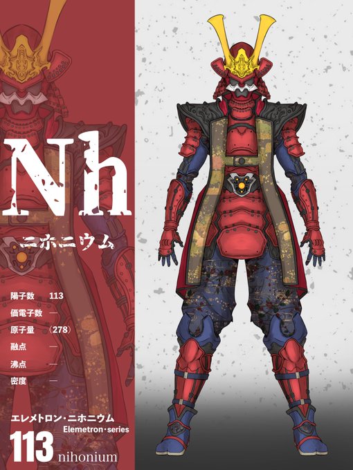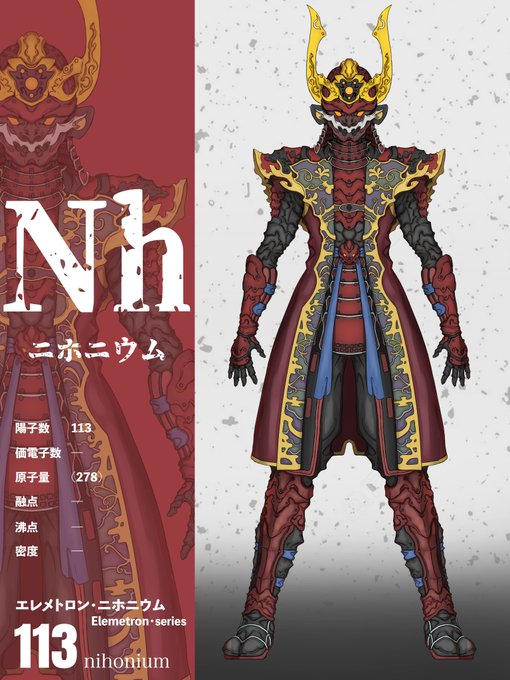 #オリジナル怪人 エレメトロン・ニホニウム 本当に怪人なのかの疑問はさておき... ど直球ストレートな鎧武者です() もはや説明の余地はありません() 下手にいじらないことによるかっこよさは出たかなと思ってます! #元素で怪人描いてみた