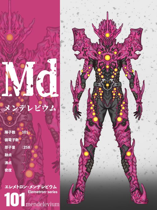 #オリジナル怪人 エレメトロン・メンデレビウム エレメトロンにあったオレンジのパーツを大増量、背面は見せていないですが背面を合わせて118個の球がある計算でデザインしています。 また、肩は元素周期表の形状をデフォルメしているものをアーマーにしています。 #元素で怪人描いてみた