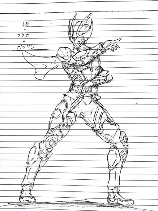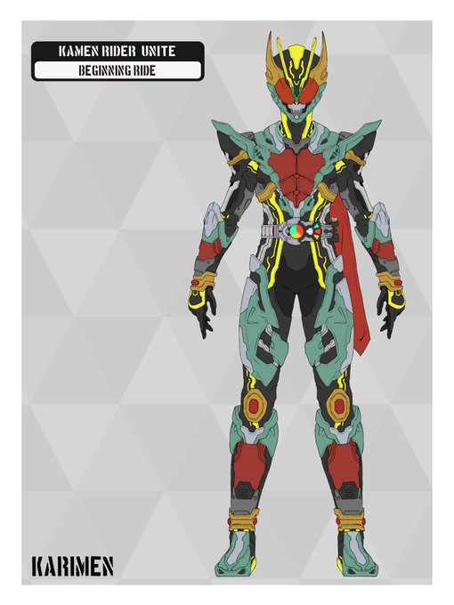 #オリジナル仮面ライダー 仮面ライダーユナイト ビギニングライド 1号×クウガ×ゼロワンのフュージョンライダーです 先に二次創作大手に描かれてるので二番煎じ感がありますが投稿します 肉体変化を強化外装で覆うコンセプトでデザインしました。