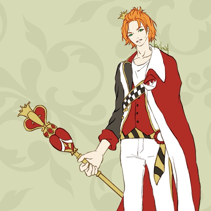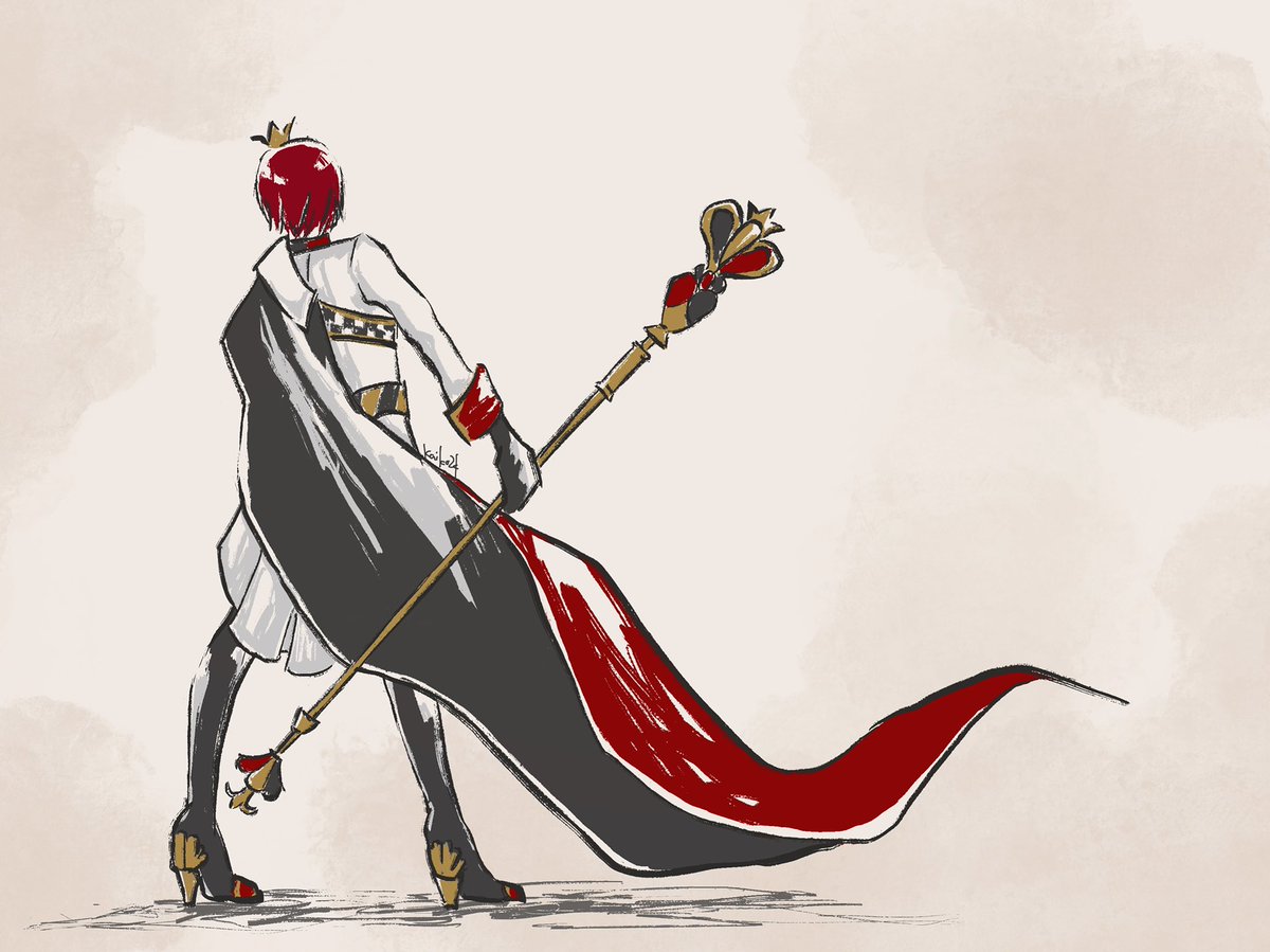 一度描いてみたかった王様ケイト。衣装捏造。 (寮長だったかどうかは別として)キャラデザがどう見てもハートの王様モチーフなので赤色マント羽織ってみてもらいたかった。 ※あまりにも赤々としていて私の目が死ぬので靴は黒配色。杖の色も女王のものとは違います #ツイステファンアート