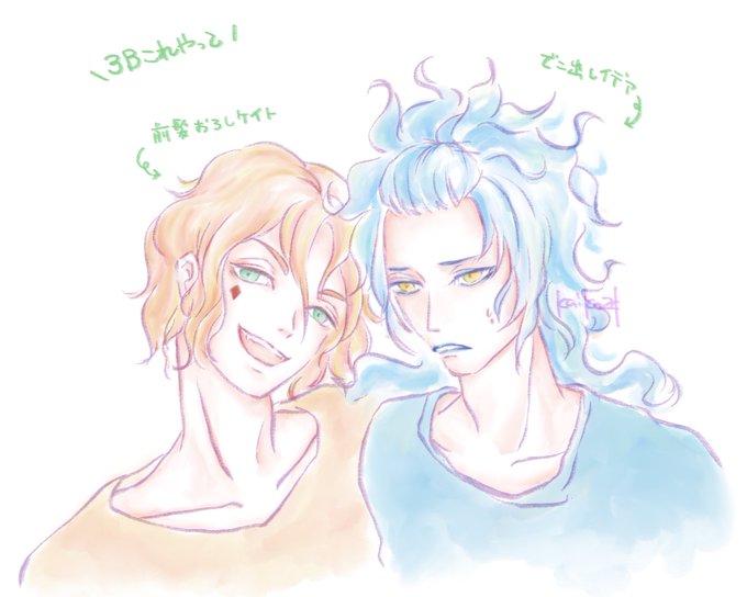 6章により「イデアはかなり良いおでこ(生え際?)をお持ちである」とお見受けしたので、3Bのクラスメイトであるお2人にはぜひ【髪型交換】をやってみていただきたく…。 #ツイステファンアート #twstファンアート