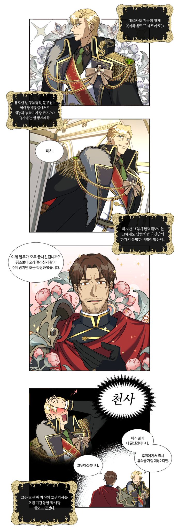 황제→호위기사 짝사랑 4컷 설정만화. 문뜩 생각나서 한번 그려봄. ㅎㅎ.... 미중년들만의 달달BL순정만화같은거 좋아해줄사람 없겠지만 내가 좋아하니 자급자족해야겠죠. twitter.com/kain00861/stat…