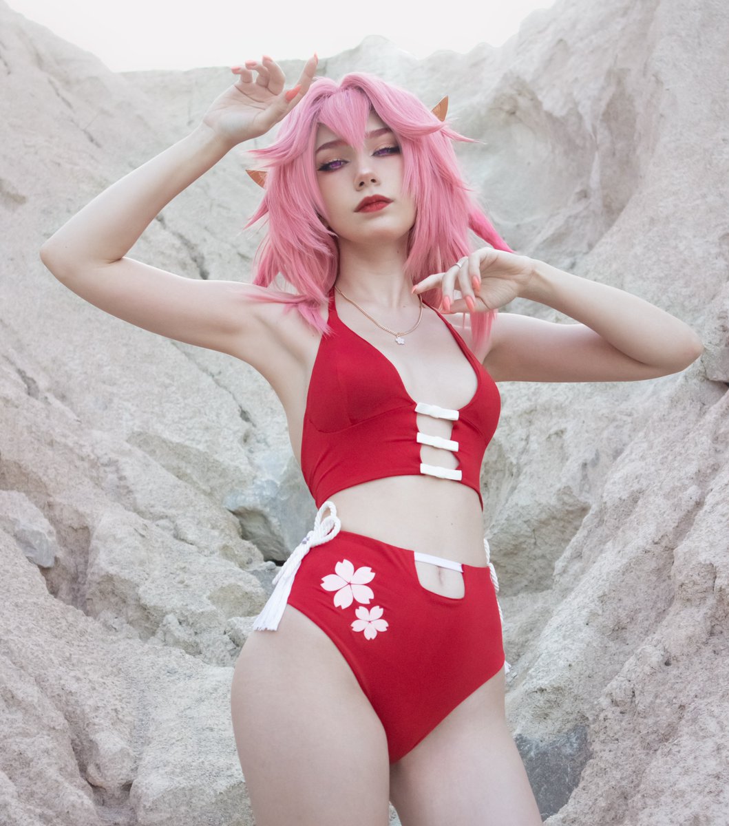[ Do you miss the pleasant summer days... or Yae Miko? 🤭 Oh, is she in a bad mood today? ] Yae Miko: @redrat_cos Swimsuit by @rickierai #genshinimpact #genshinimpactcosplay #yaemiko #yaemikocosplay #cosplay