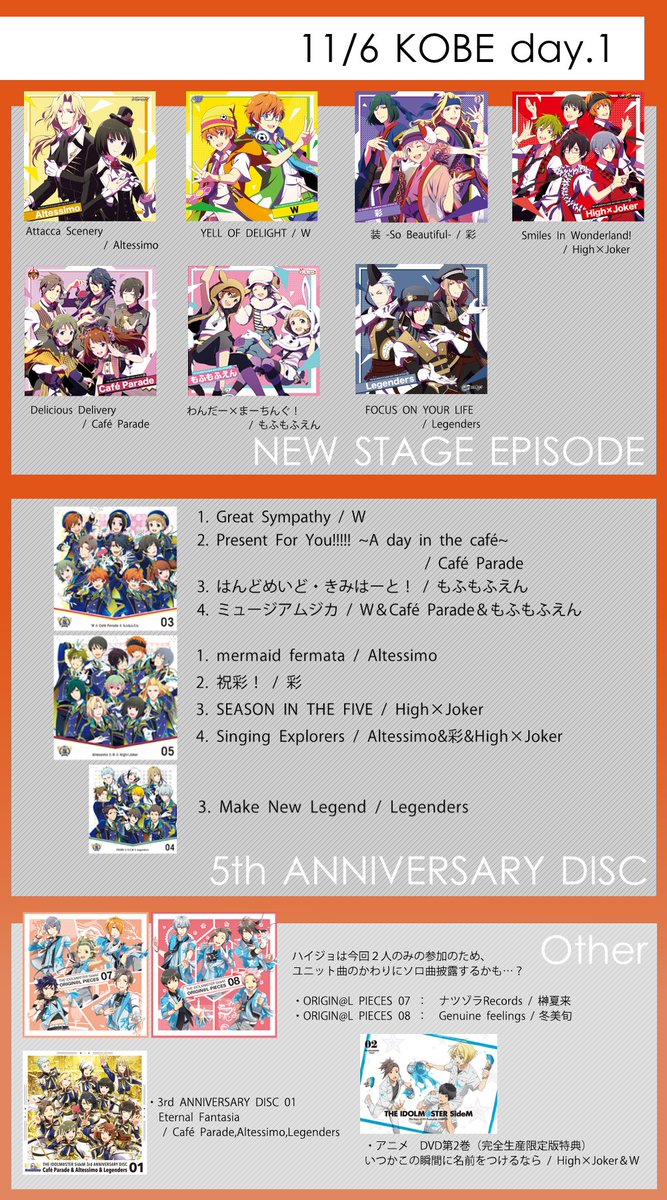 SideM神戸公演まであと少しということで、ライブ気になってる新人Pさん向け楽曲予習リスト作りました! ユニットや合同曲での欠員もあり…正直なんともいえないのであくまで参考程度でお願いします。 全体曲は外してるし特にOther項目は完全に私の予想です!