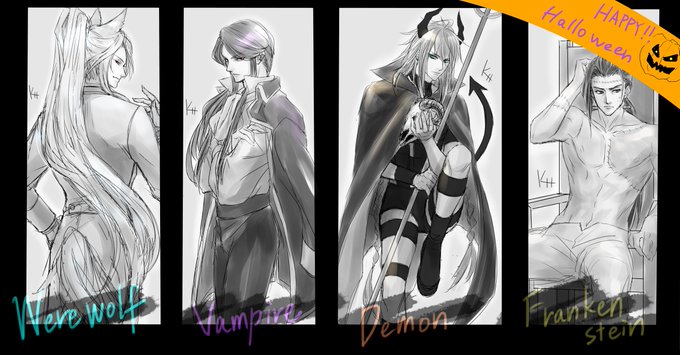 19 54 HappyHalloweenヾ(❀╹◡╹)ノ゙❀~~~ 凜雪鴉→狼男 殺無生→ヴァンパイア 浪巫謠→悪魔(?)w 殤不患→フランケン で描いてみたけど、やっちまった感が拭えないwwww けどまあいいや(´・ω・`)← 22/10/30 23:09