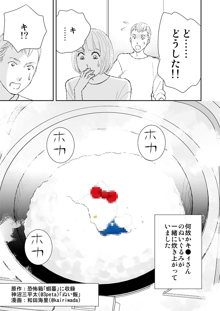原作:神沼三平太( @3peta )「恐怖箱 蝦蟇」(竹書房文庫)収録「ぬい飯」漫画:和田海里( @kairiwada )#実話怪談 #漫画が読めるハッシュタグ