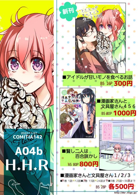 明日11月27日に開催されるコミティア142に参加します! スペースはA04b「H.H.R」です。 前回の「漫画家さんと文具屋さん456」が「Push&Review」に載るらしいです嬉しい! 新刊は「アイドルが甘いモノを食べるお話」です よろしくお願いします! #コミティア142 #コミティアお品書き