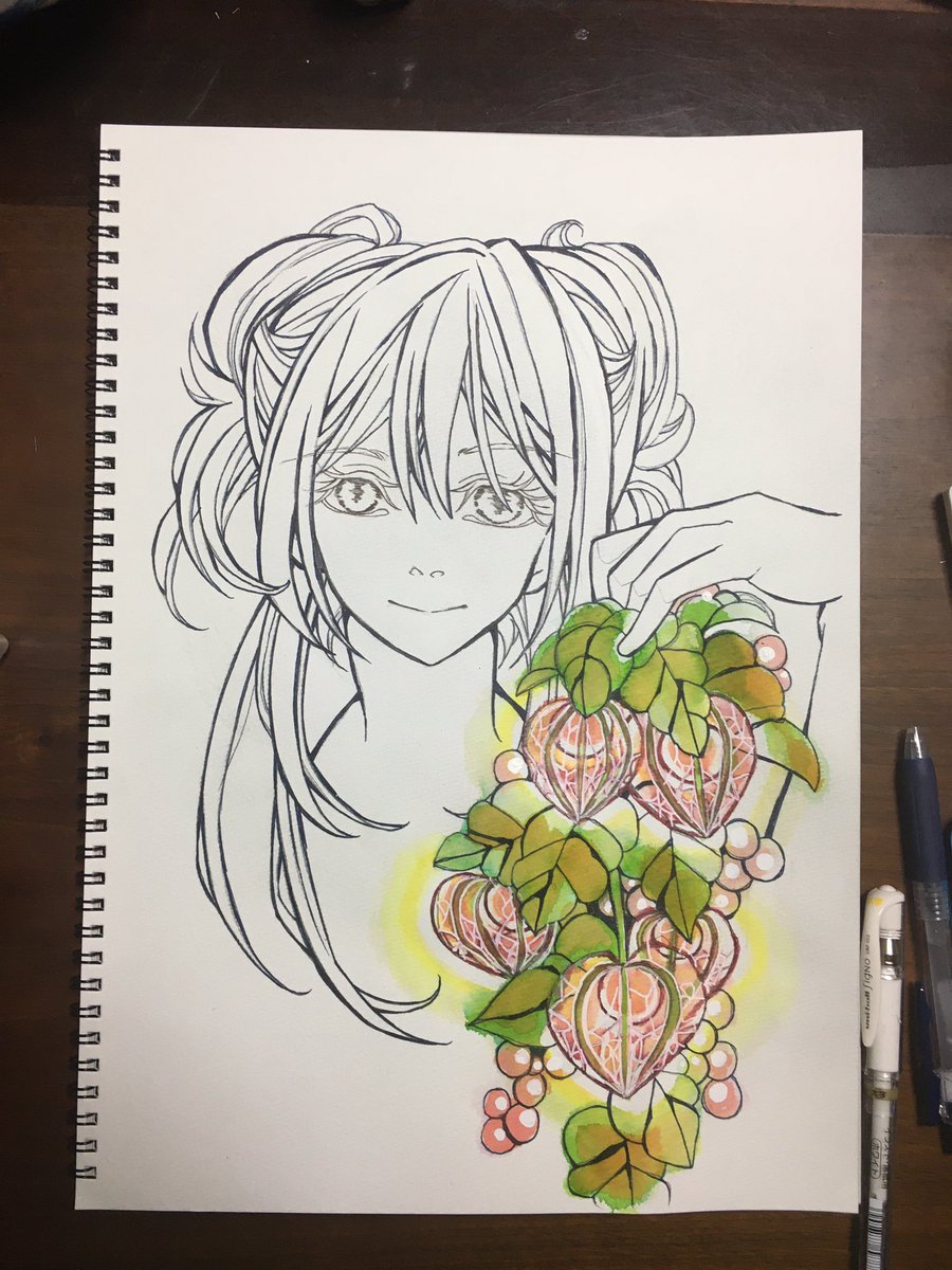 #イラスト #アナログ #カラーインク #透明水彩 #絵描きさんとつながりたい #絵描きさんと繋がりたい 鬼灯楽しい。