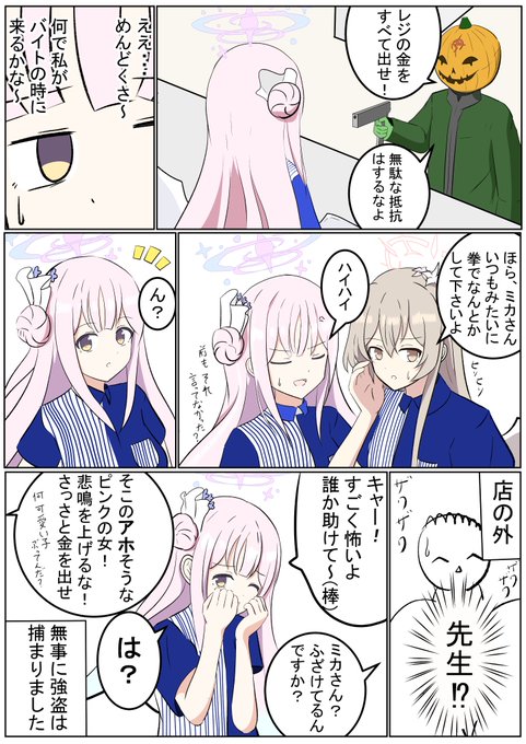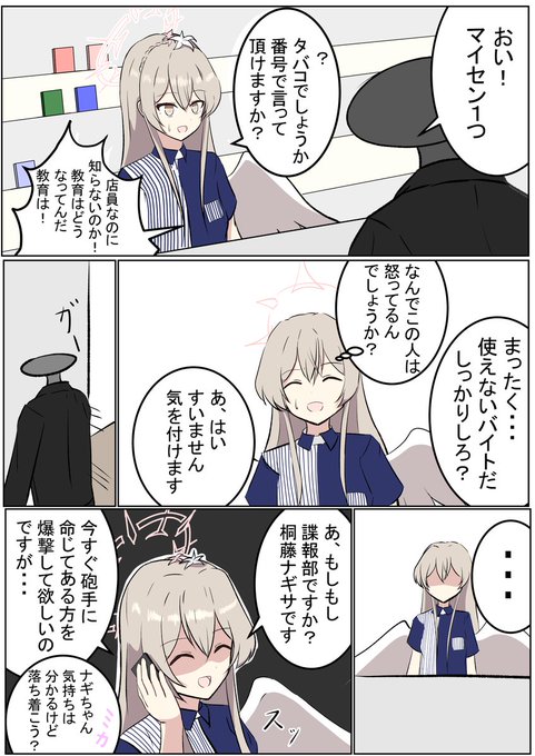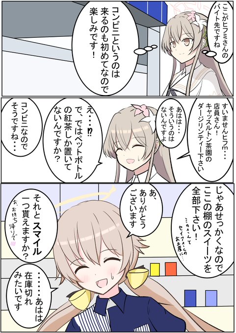 ローソンコラボという事でペロログッズの資金の為バイトするヒフミさんです! ナギサ「スマイルはいただけませんでしたが、コンビニのロールケーキも悪くありませんね」 ミカ「ナギちゃんは世間知らずだもんね☆」 セイア(君がそれをいうのか......) #ブルアカ #BlueArchive
