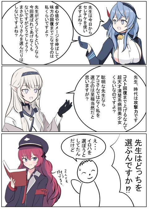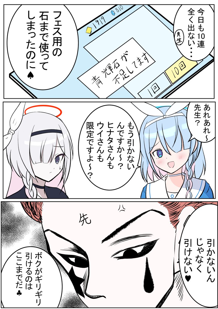 アロナ「奇術師(先生)に不可能はないって言ってたじゃないですか? それに『君達まとめてこれ一枚(チケット)で十分かな♣︎』って笑」 プラナ「先輩...あまり煽るのは...」 先生「そんな目で見つめるなよ......」 #BlueArchive