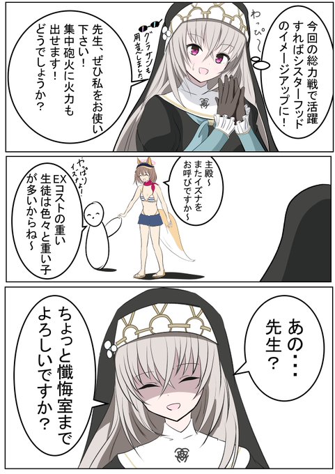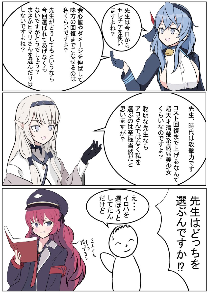 サクラコ「そんなこと言ったらナギサさんが3コストなのおかしいです!」 マリー「落ち着いてください、サクラコ様!」 ヒナタ「私はミカさんと同じ......」 #ブルアカ #BlueArchive