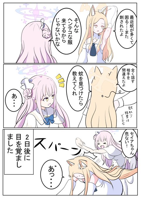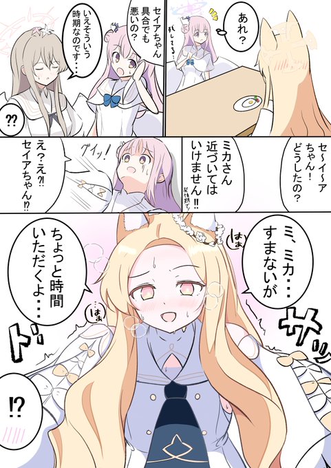 キツネは発情期になると何も食べなくなると最近知ったのでその漫画です! セイア「ミカ......いつものお返しだよ」 ミカ「セイアちゃんまずいって!ナギちゃんも見てないで助けて?!」 ナギサ「この時期のセイアさんは力が増すので無理です///」 #ブルアカ #BlueArchive