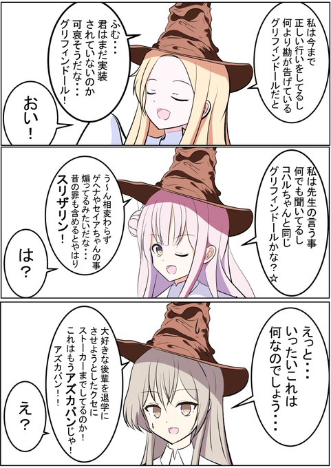 セイア「ま、まあ勘の通りだったね」 ミカ「闇の魔法使い...?この帽子引きちぎってもいいかな?」 ナギサ「アズカバンってなんでしょう?ヒフミさんもいるんでしょうか?」 #ブルアカ #BlueArchive