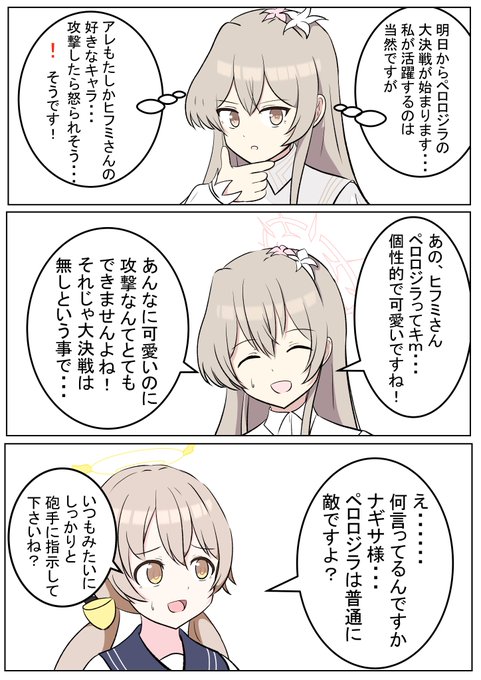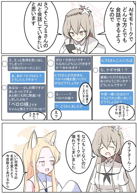 ミカ「このやりとりナギちゃんとあの子にすごい似てるね......」 ナギサ「もう一回データをリセットしてトークをやり直しです!」 セイア「ナギサ、現実の人間関係ならリセットできないのだよ?だから慎重にだな......」 #ブルアカ #bluearchive