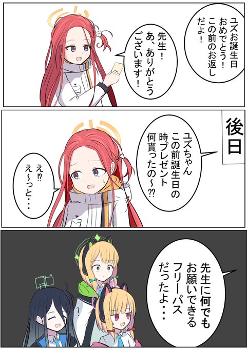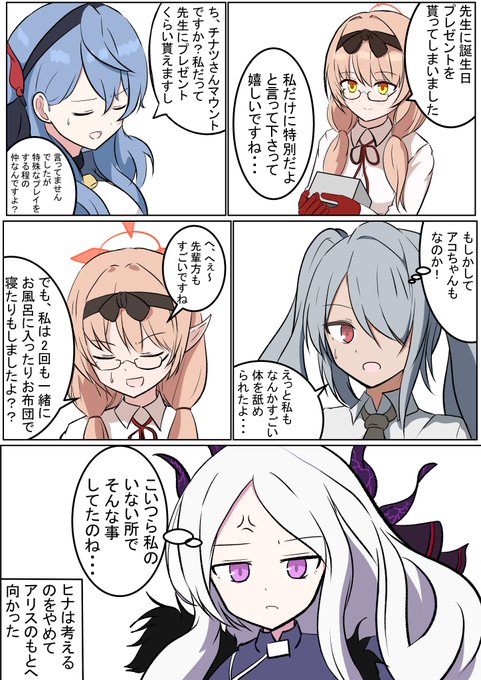 チナツの誕生日という事で風紀委員会の漫画です!(風紀?) アコ「そういえば委員長最近よくシャーレに行ってましたね?」 チナツ「なんでも先生の頭を洗ってあげたり色々お世話したとか...」 ヒナ「なんでわかるのよ?」 #ブルアカ #BlueArchive