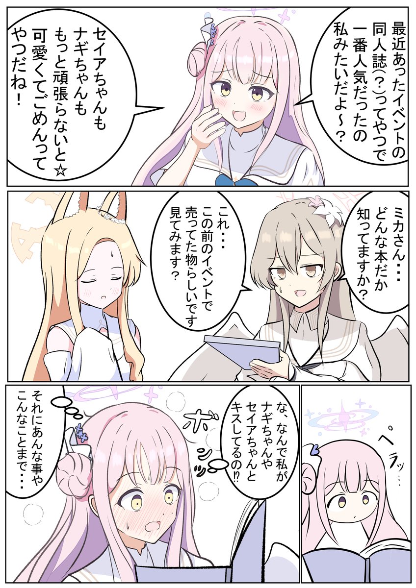 今日から同人イベントということなので! 女の子を赤面させるの好きかもです... ナギサ「こういう本ばかりではありませんが」 セイア「分かったかい?人気があるという事は...」 ミカ「ちょ、ちょっと風にあたってくるね///」 #ブルアカ #BlueArchive