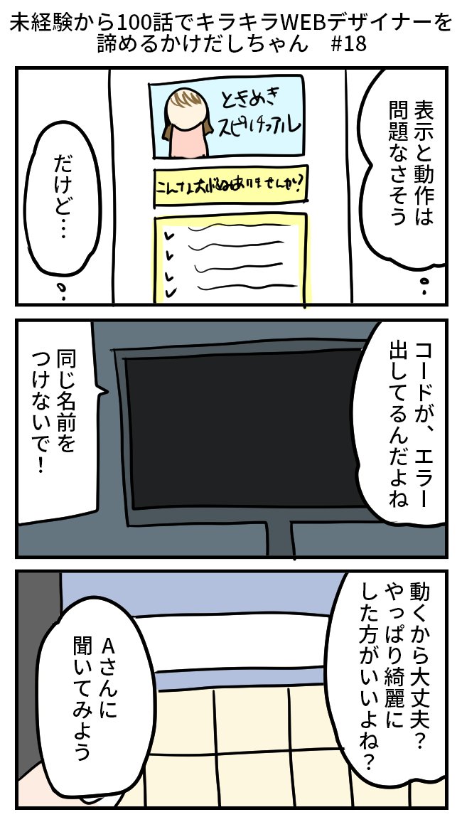 【再掲】未経験から100話でキラキラWEBデザイナーを諦めるかけだしちゃん その18 👩「現役のプロが大丈夫と言ってるから業界的にそんなものだと思っちゃった」 🧑💻「少なくとも教える人間が、エラーが出ても大丈夫と言うのはおかしいよ」 #漫画が読めるハッシュタグ