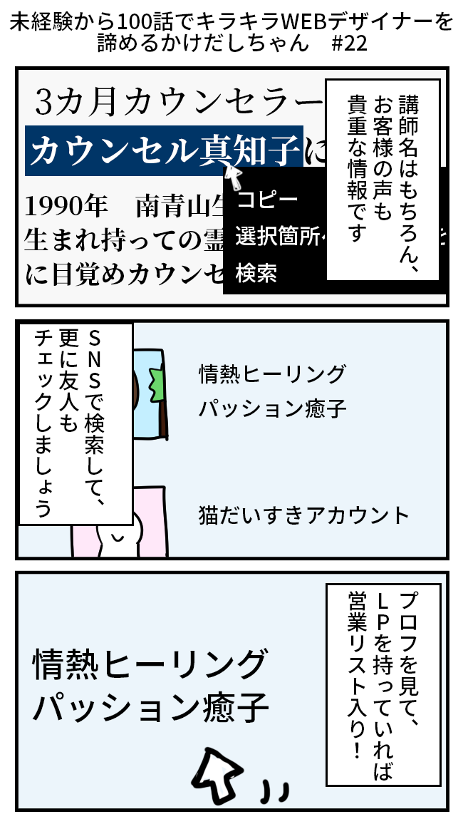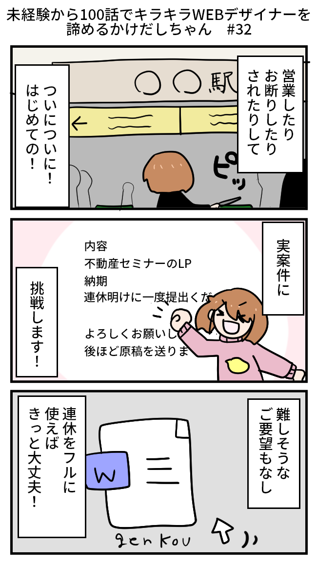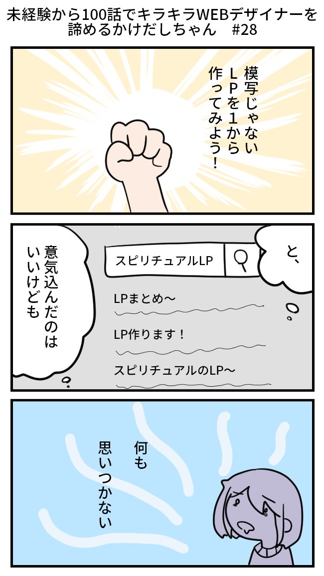 【再掲】未経験から100話でキラキラWEBデザイナーを諦めるかけだしちゃん その20 🧑💻「本当にこのタイミングで営業するの?人のものを写すことしかやっていないのに?他人のサービスの成果を預かるの?成果を出すLPが作れるとでも?」 👩「うぐ」 #漫画が読めるハッシュタグ