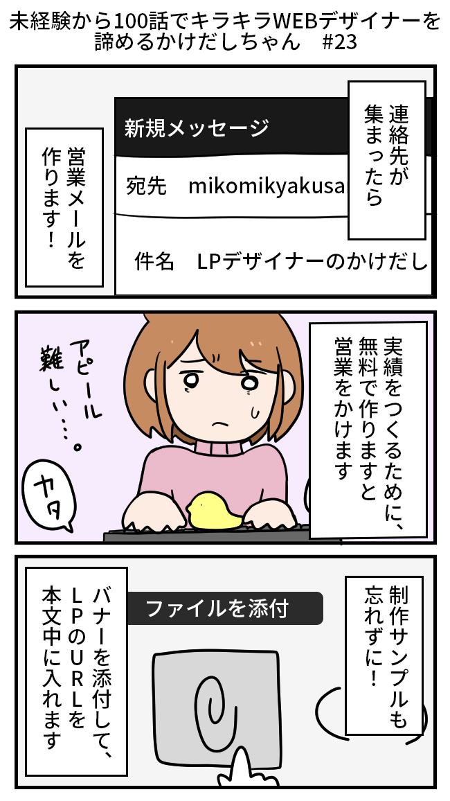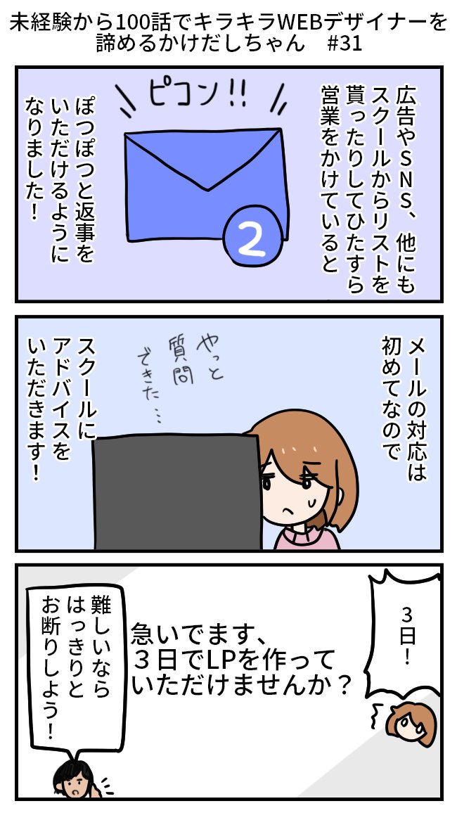 【再掲】未経験から100話でキラキラWEBデザイナーを諦めるかけだしちゃん その21 🧑💻「その発想はなかった。広告出して営業メールが届くって、なんだか悲しいね」 👩「エンジニアちゃんは、はじめての副業からして紹介で仕事貰ってきてましたよね…羨ましいよー!」 #漫画が読めるハッシュタグ