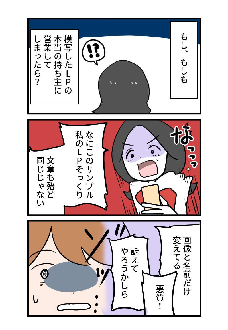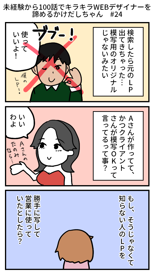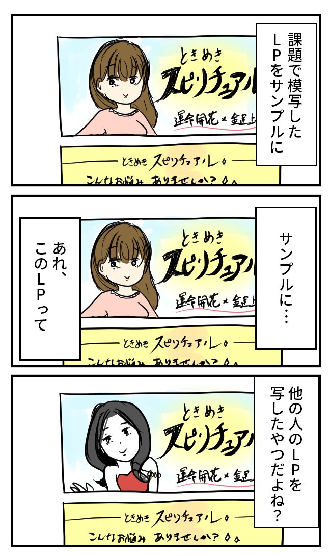 【再掲】未経験から100話でキラキラWEBデザイナーを諦めるかけだしちゃん その23 👩「さすがにばれそうでまずいと思って…」 🧑💻「そもそもLPの持ち主に許可を取っていないとしたら、スクールの模写教材にすること自体駄目だよね。他人のLPでお金取ってるわけで」 #漫画が読めるハッシュタグ