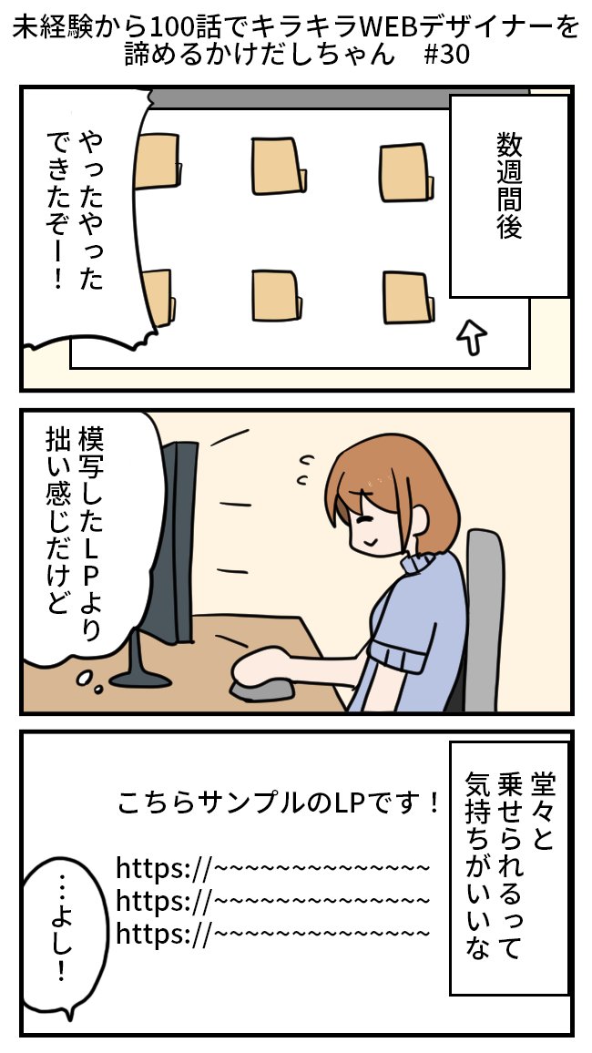 【再掲】未経験から100話でキラキラWEBデザイナーを諦めるかけだしちゃん その32 🧑💻「このLPは、画像だけで作ったんだっけ?」 👩「そうそう!大変だったよ~!今思えば、HTML/CSSが使えていればそこまで苦労しない構成だったかも」 #漫画が読めるハッシュタグ