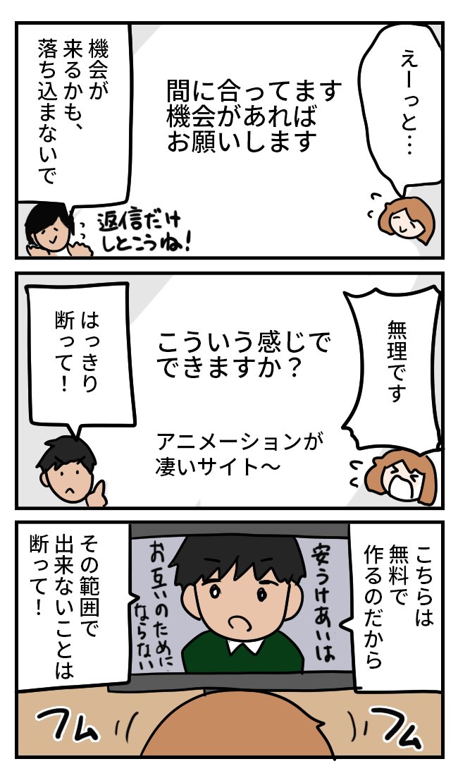 31話 【再掲】未経験から100話でキラキラWEBデザイナーを諦めるかけだしちゃん その31 🧑💻「無料で作ることについてはさておき、安請けあいしないことは大事だと思う」 👩「ですねぇ(しみじみ)」 #漫画が読めるハッシュタグ