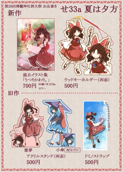 58 121 5月7日の第20回博麗神社例大祭のお品書きです。 頒布物の詳細はリプに続きます。 他に増やせたらまたアナウンスします。 23/04/23 18:38