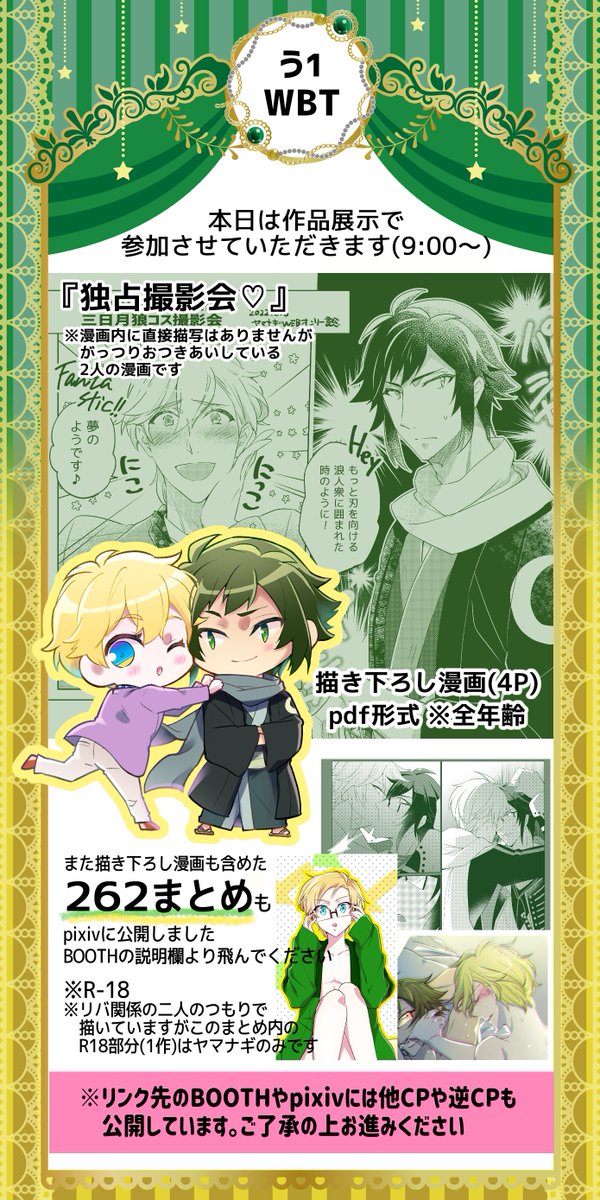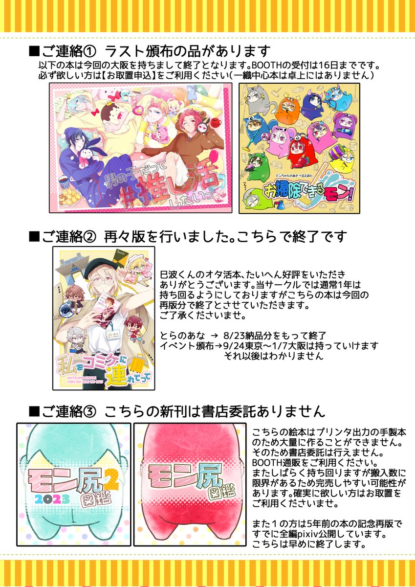 【お品書き】 スパステ2023夏 6号館Dハ01a 4年半ぶり?に本人もいる大阪参加です! 大阪初頒布品たくさんとモン尻を愛でる絵本が電撃復活します。 おしゃべり・スケブ大歓迎!!ペーパー類だけでもぜひおもちくださいませ💛 本文見本 pixiv.net/artworks/11084… 取置申込 ws.formzu.net/dist/S90966726/