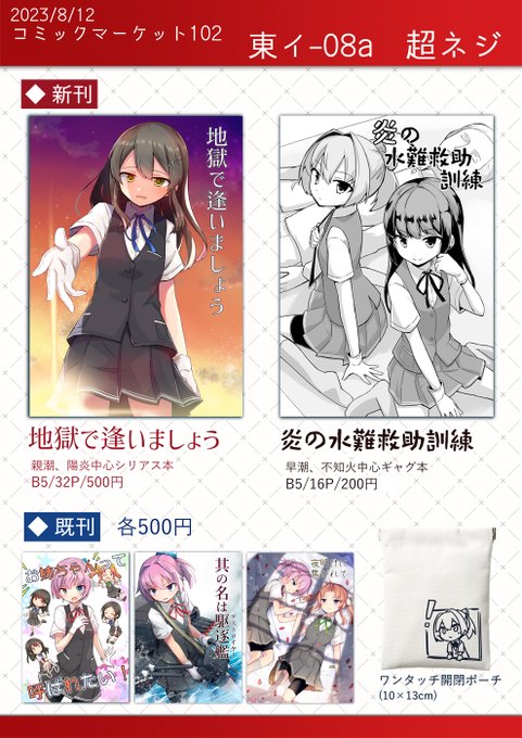 夏コミの新刊です。ある日突然艦隊を去ってしまった親潮を陽炎が追いかける話です。 (B5/32P/500円) 委託⇒melonbooks.co.jp/detail/detail.… BOOTH⇒choneji.booth.pm/items/4975088 よろしくお願いします!